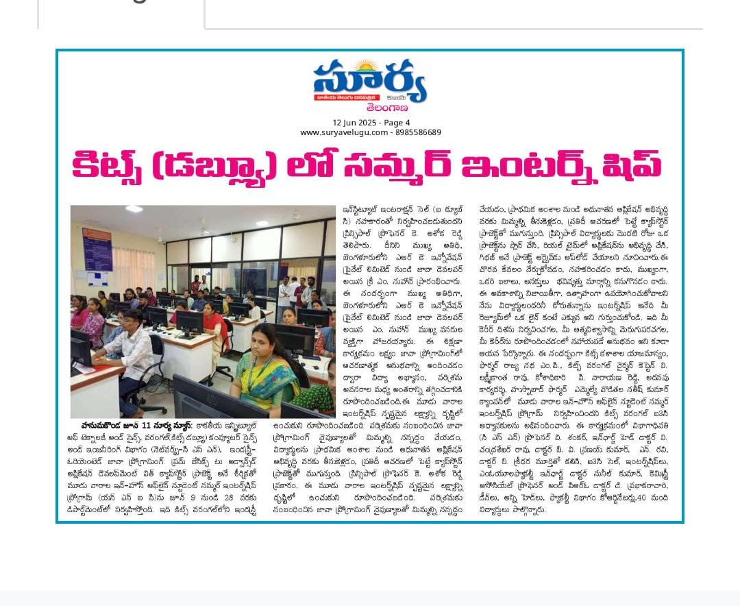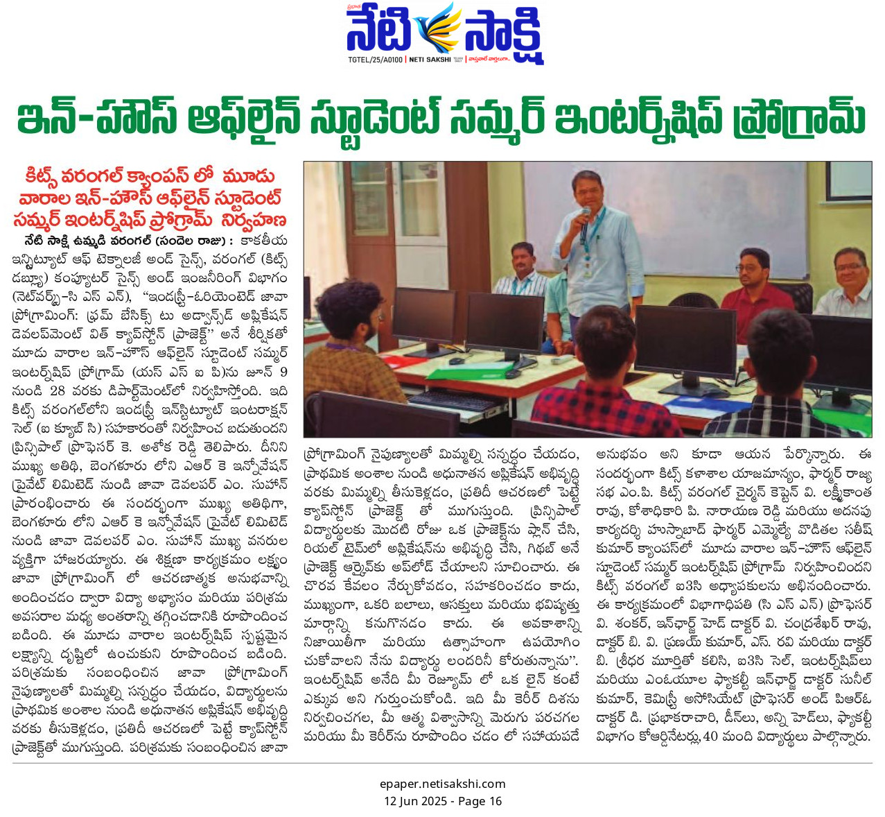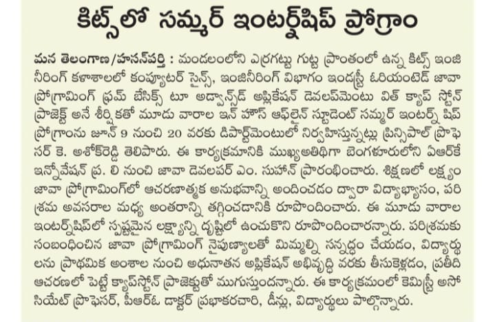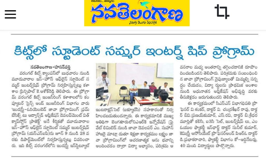 Department of Computer Science & Engineering(Networks) in association with Industry Institute Interaction Cell(IIIC) is organising a three-week in-house offline Student Summer Internship Programme(SSIP) titled "Industry-Oriented Java Programming: Froom Basics to Advanced Application Development with Capstone Project" from 9 - 28 June, 2025 @ KITS, Warangal.