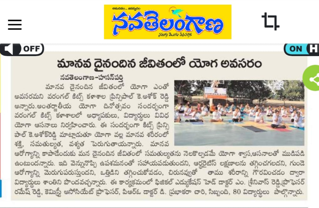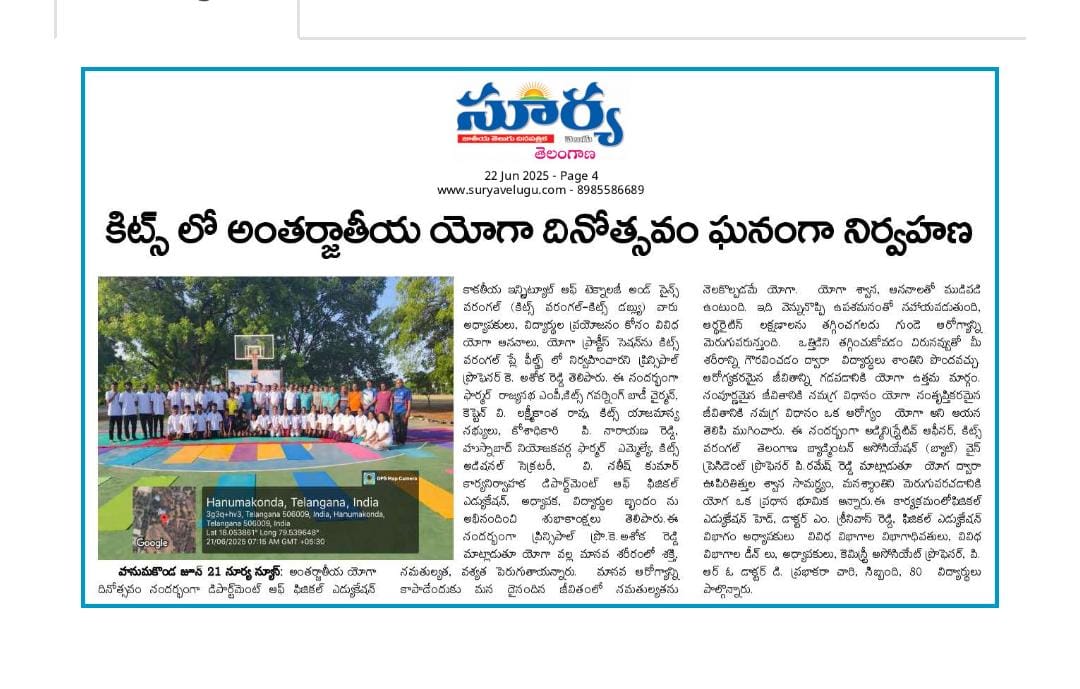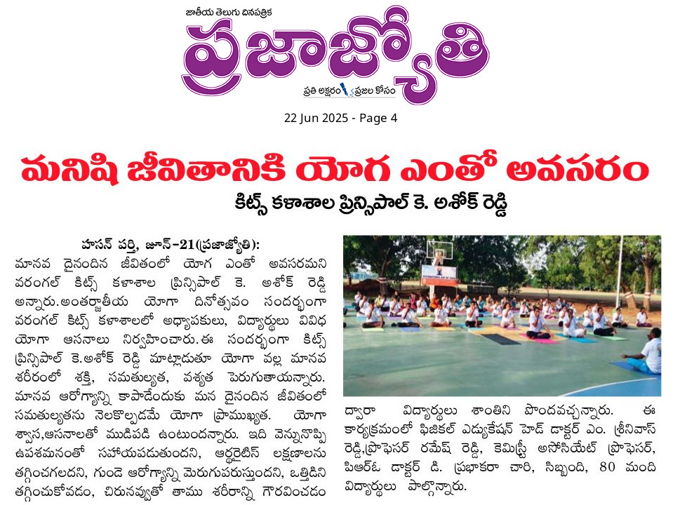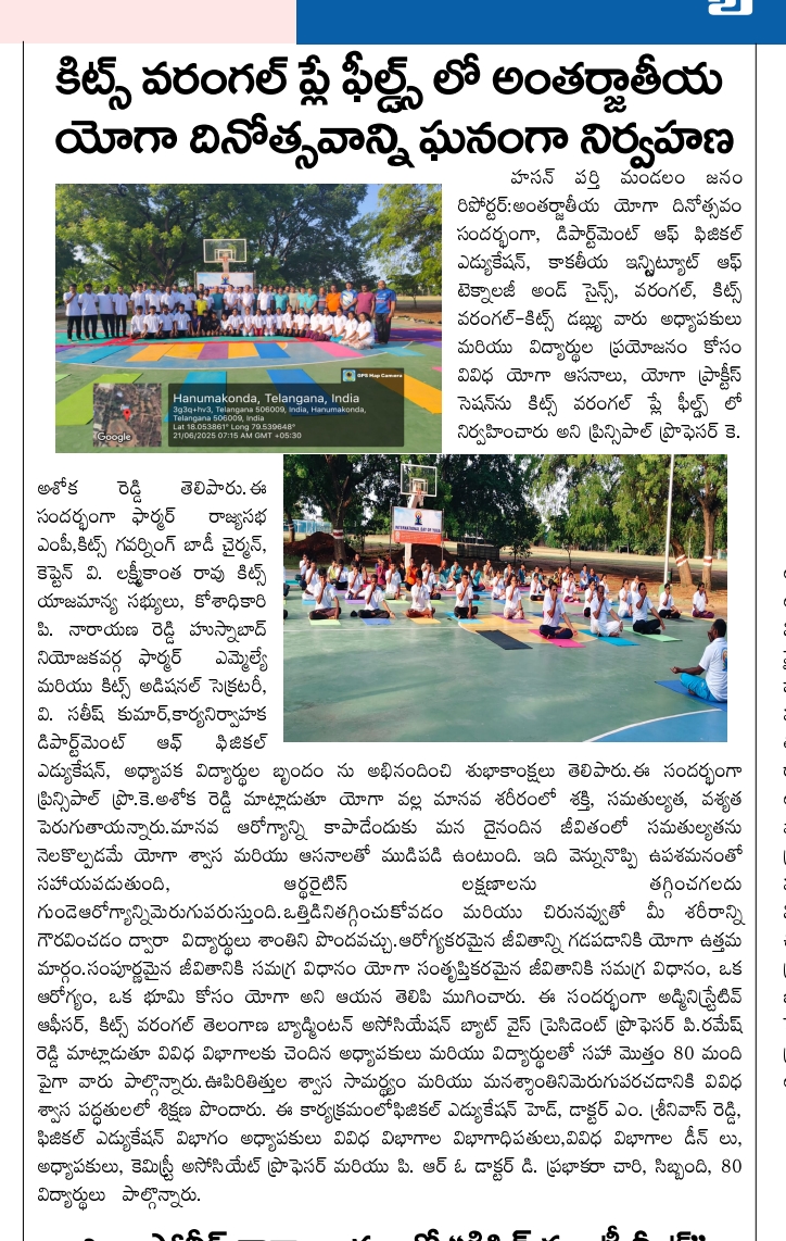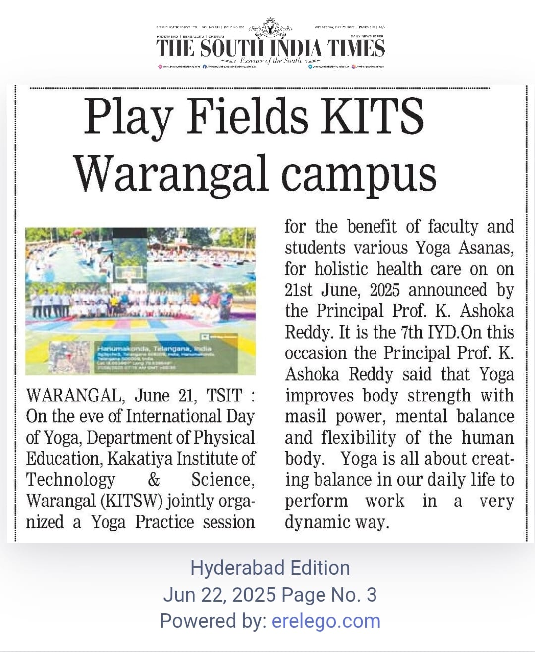 On the eve of International Day of Yoga, Department of Physical Education and KITS, Warangal jointly organised a Yoga Practice Session on 21st, June, 2025 @ Play Fields, KITS, Warangal Campus.