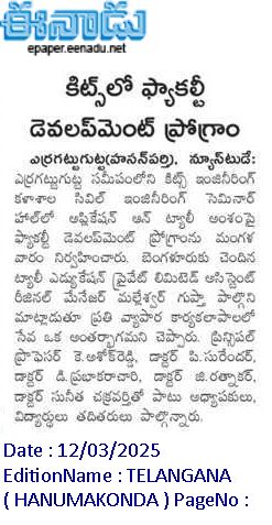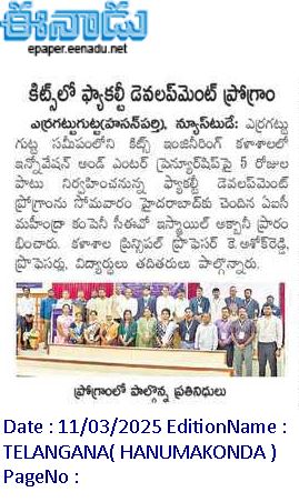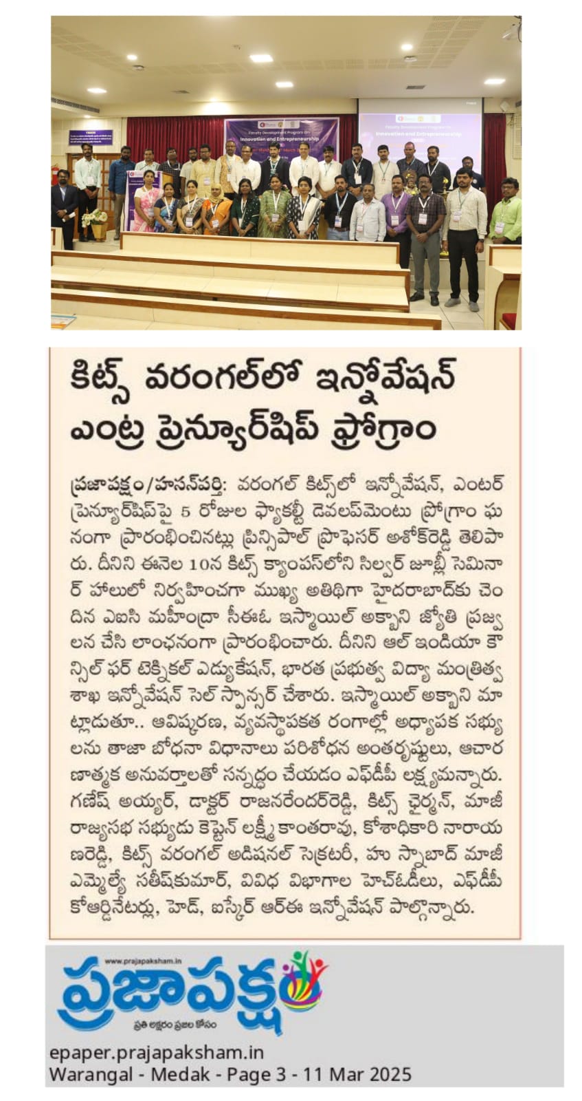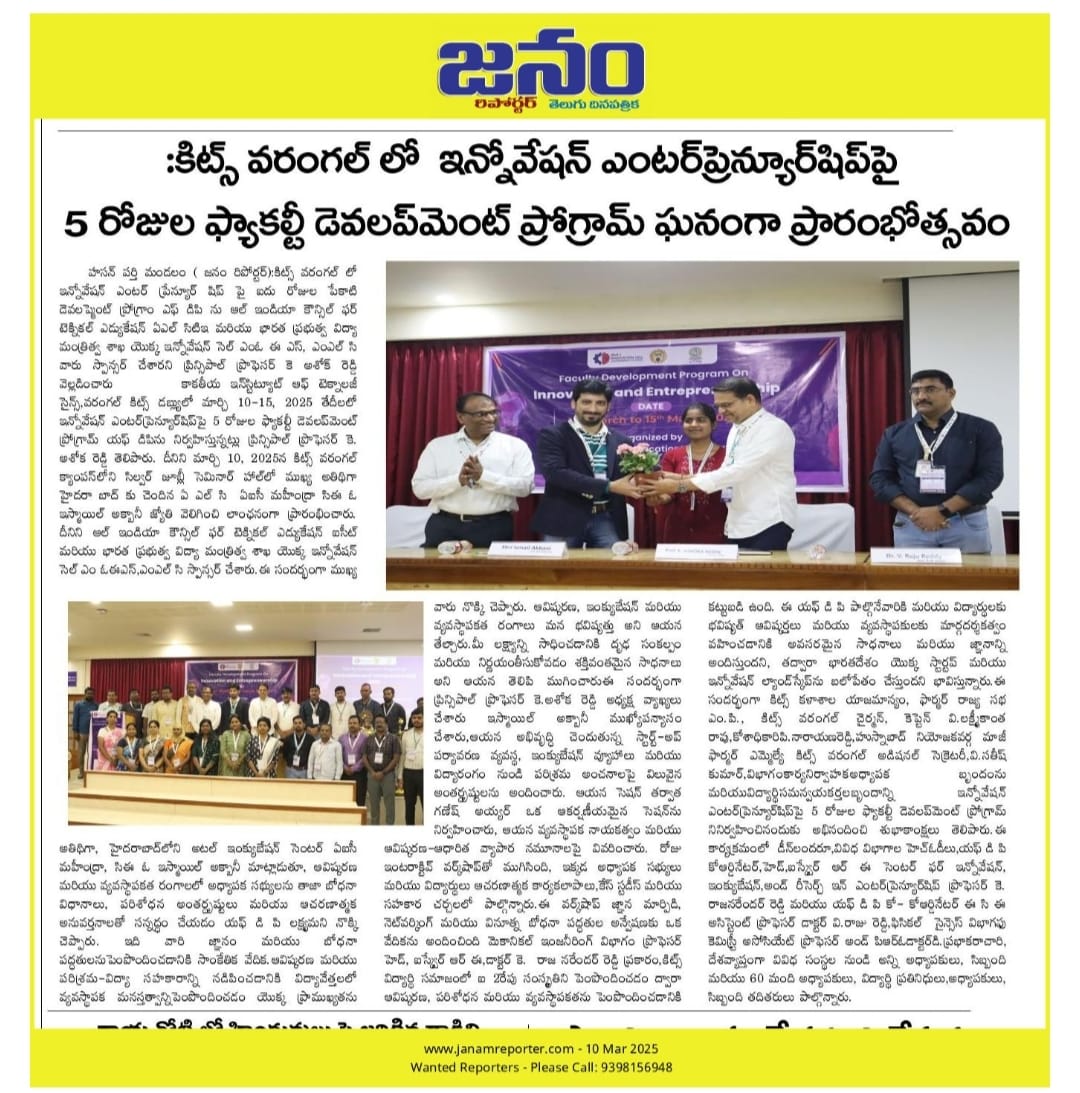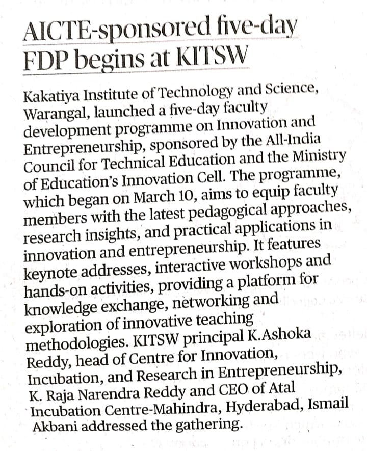 KITS, Warangal conducted AICTE and Ministry of Education's Innovation Cell sponsored five-day Faculty Development Programme(FDP) on "Innovation and Entrepreneurship" during 11th to 15 th March, 2025 @ KITSW.