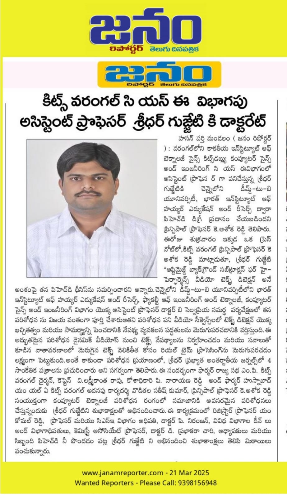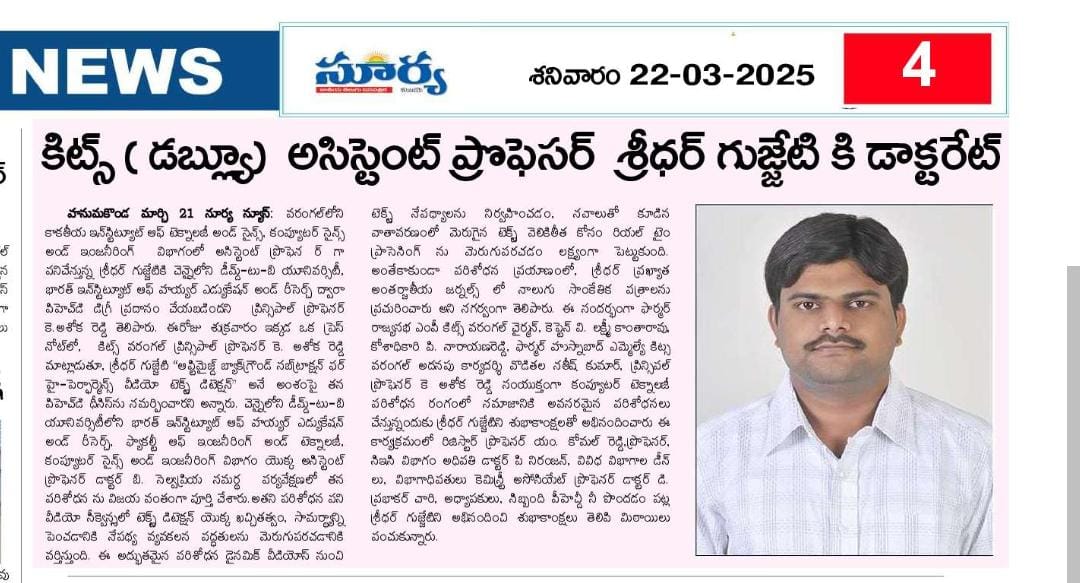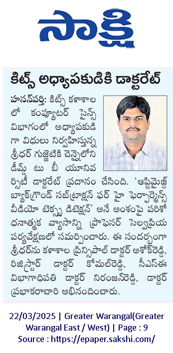 Sri G.Sridhar, Assistant Professor in the Department of Computer Science and Engineering(CSE) has been awarded Ph.D. degree by the Bharath Institute of Higher Education and Research(BIHER) deemed-to-be-university, Chennai, Tamilnadu for his thesis "Optimized Background subtraction for High-Performance Video Text Detection".
