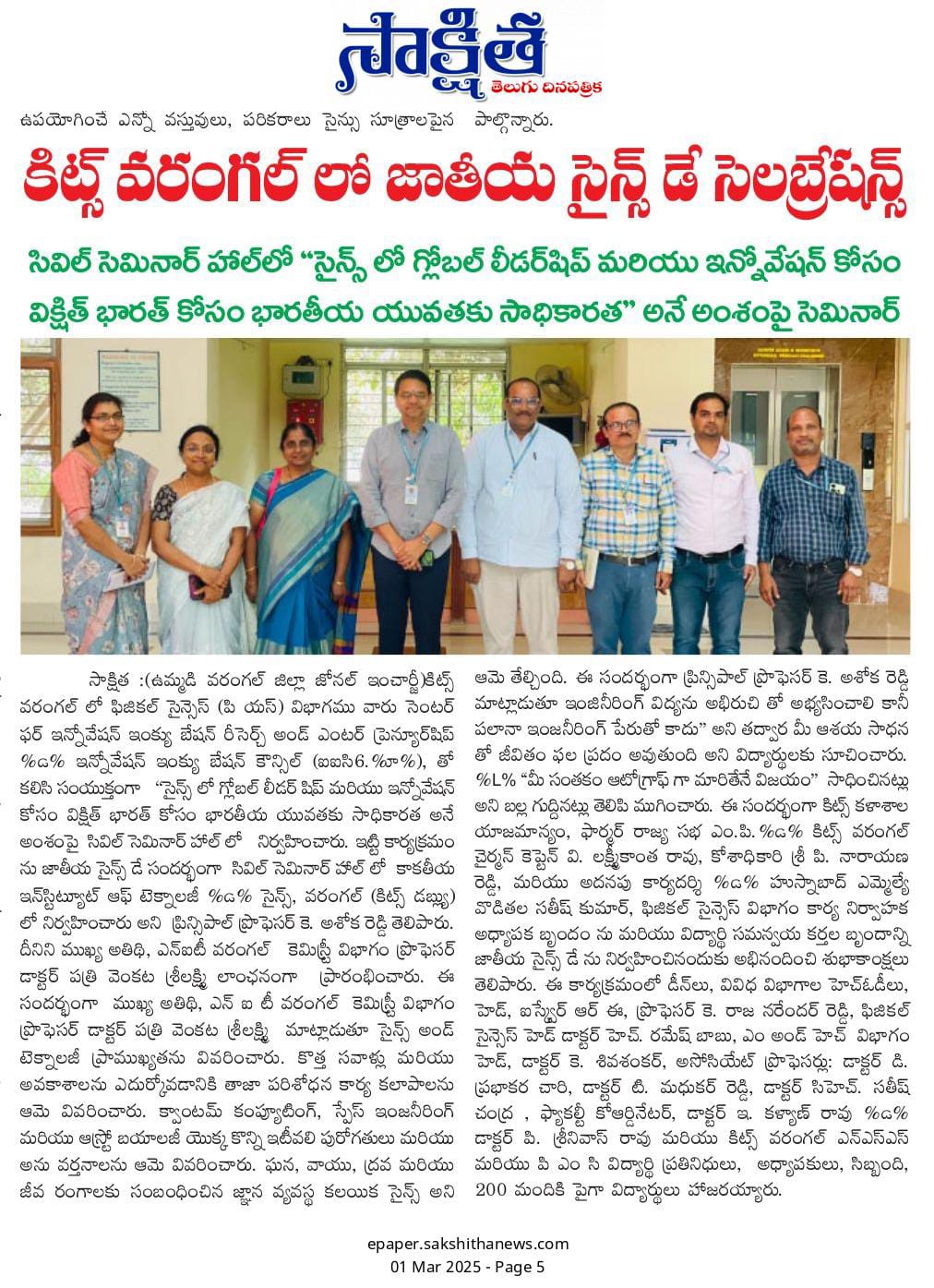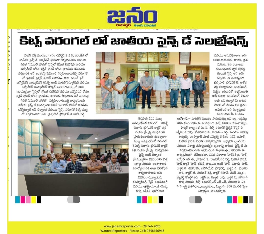 Department of Physical Sciences and Centre for Innovation Incubation Research and Entrepreneurship (C-IIRE) organized National Science Day celebrations @ KITSW.
