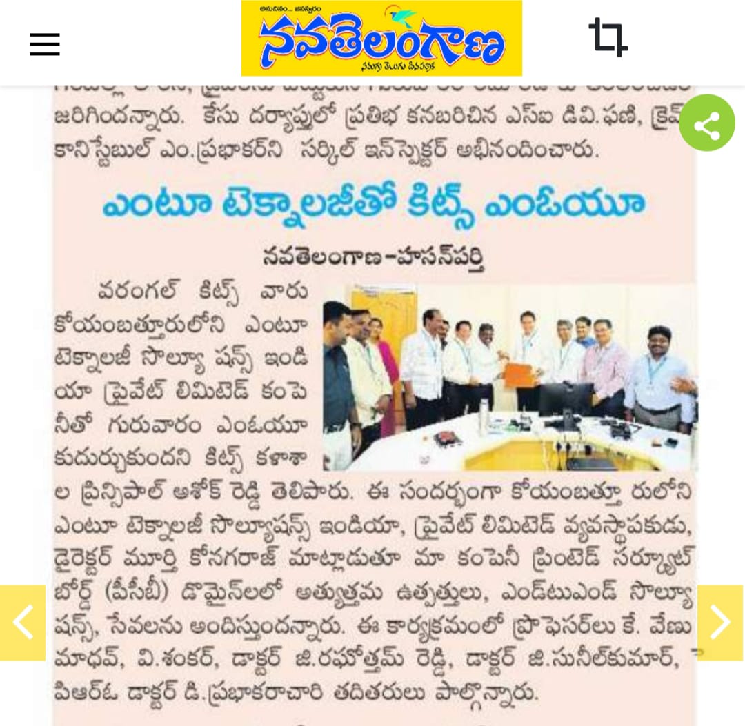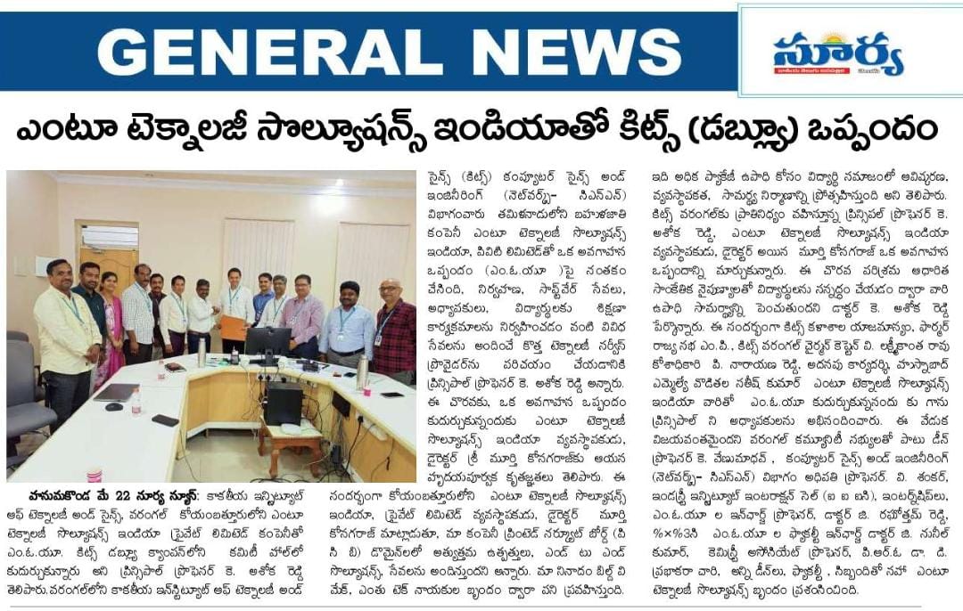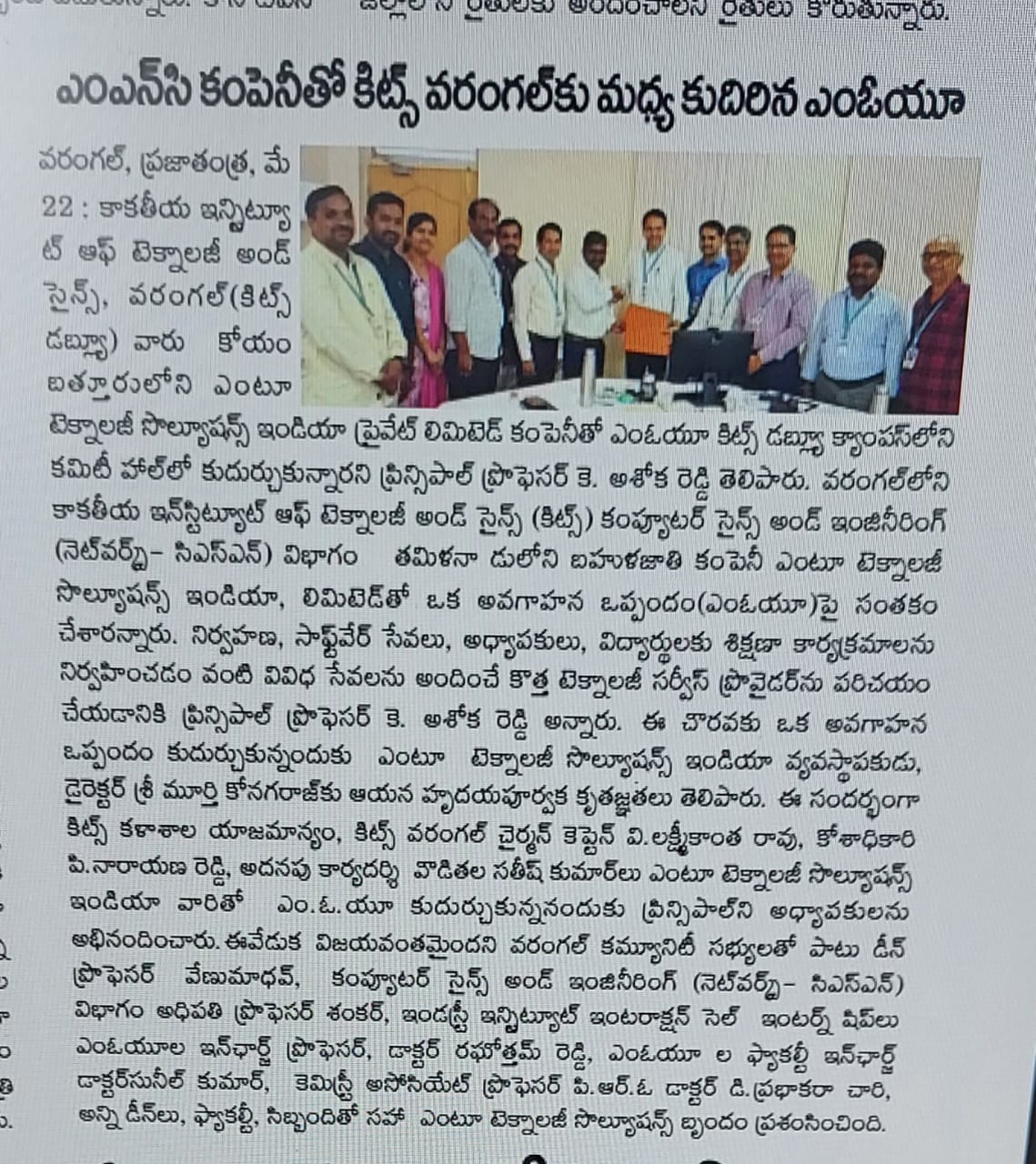 Kakatiya Institute of Technology and Science, Warangal, has a Memorandum of Understanding (MoU) with ENTU Technology Solutions India on 22nd May, 2025.