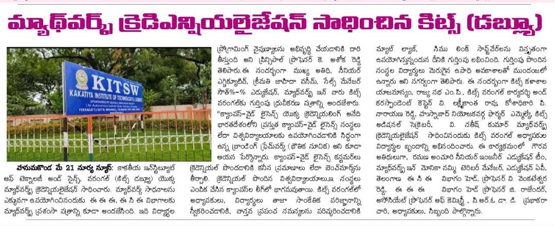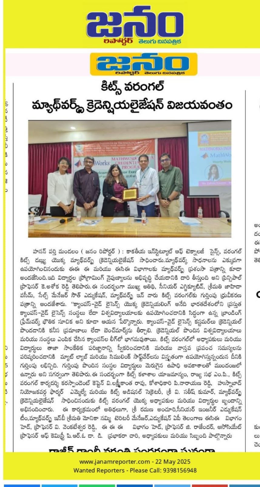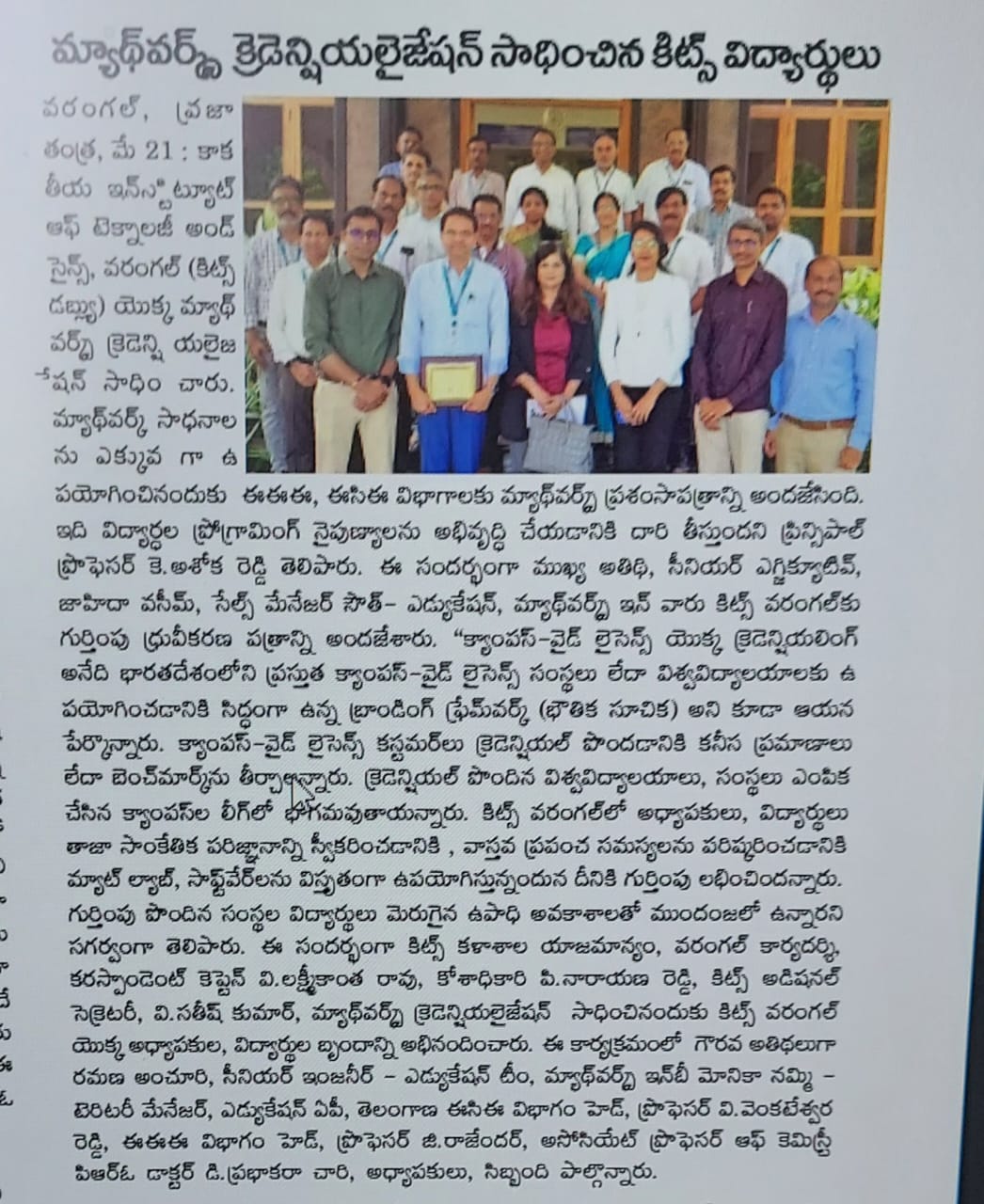 Kakatiya Institute of Technology and Science, Warangal has been officially recognized as a Mathworks Credentialed Institute for its extensive and effective use of MATLAB and Simulink Integration software tools in Academic Teaching and Research.