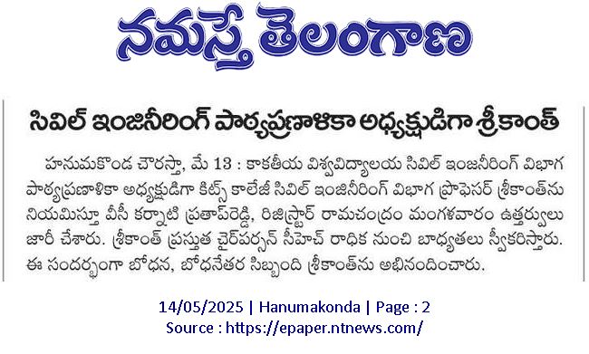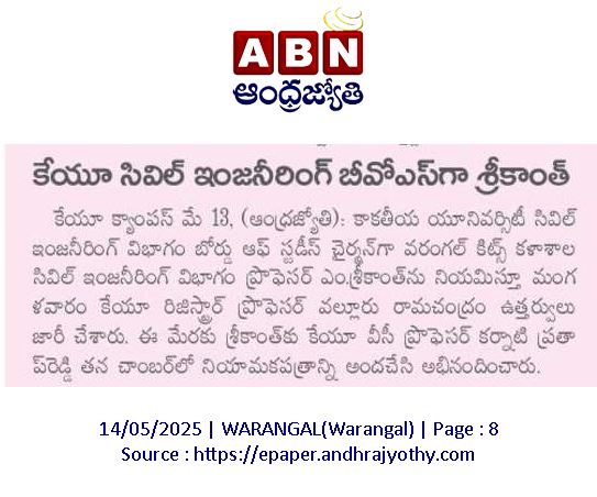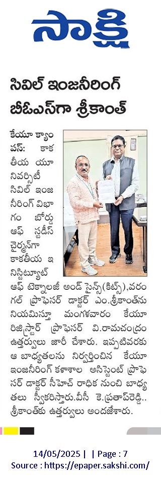 Prof. V. Ramachandram, Registrar of Kakatiya University, has appointed Dr. M. Srikanth, Professor and Head of the Department of Civil Engineering, KITS Warangal, as Chairman of the Board of Studies (BoS) in Civil Engineering at Kakatiya University, Warangal.