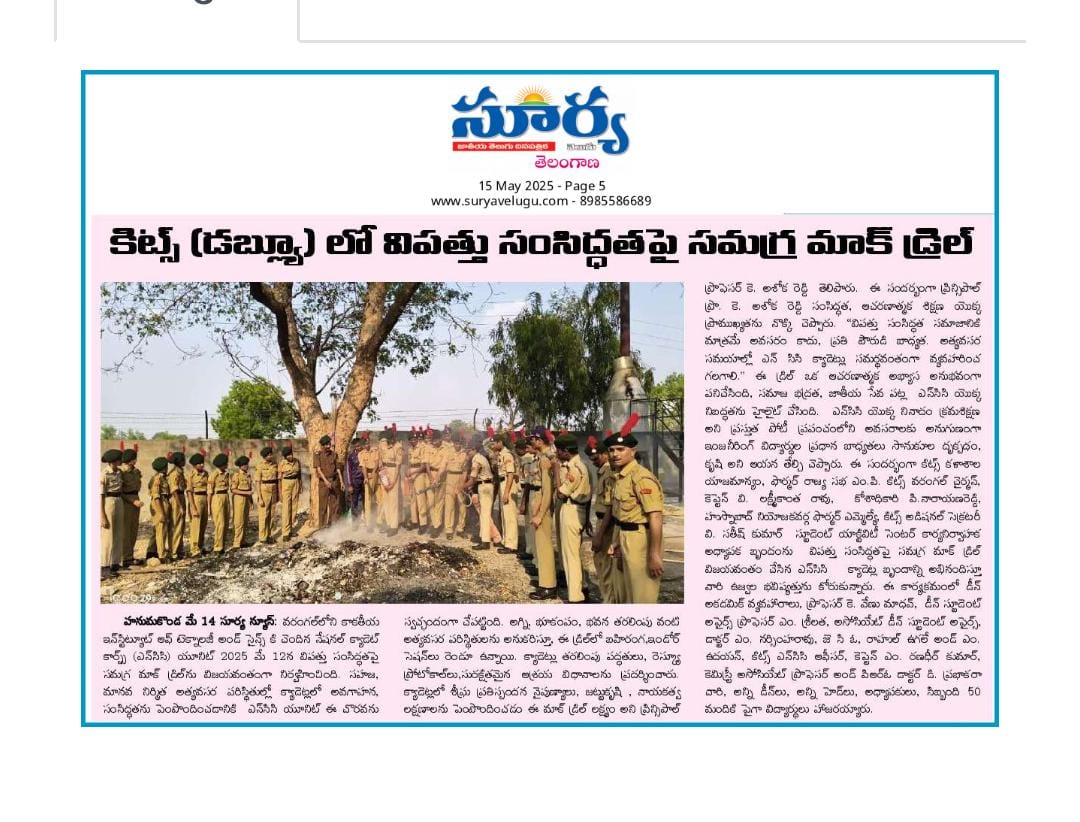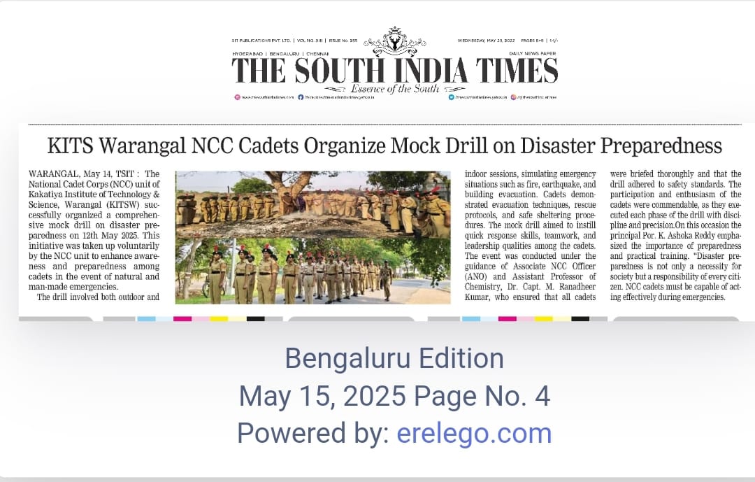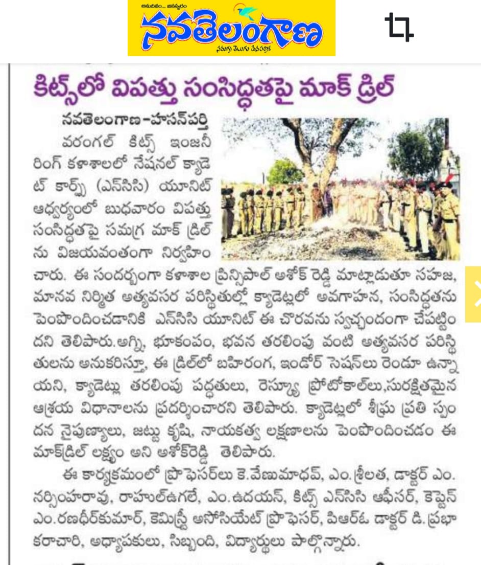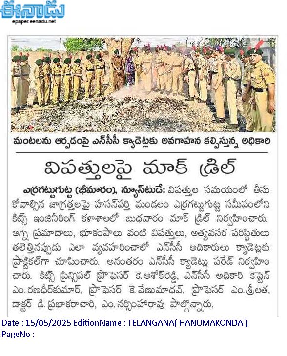 KITS, Warangal NCC Cadets organize Mock Drill on Disaster Preparedness.