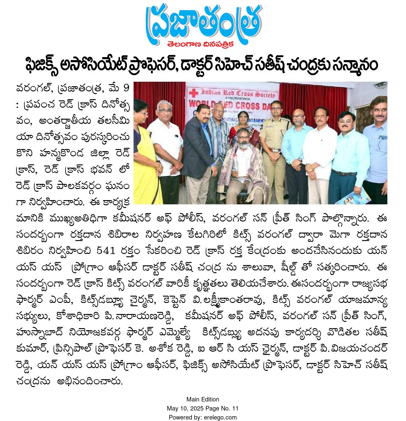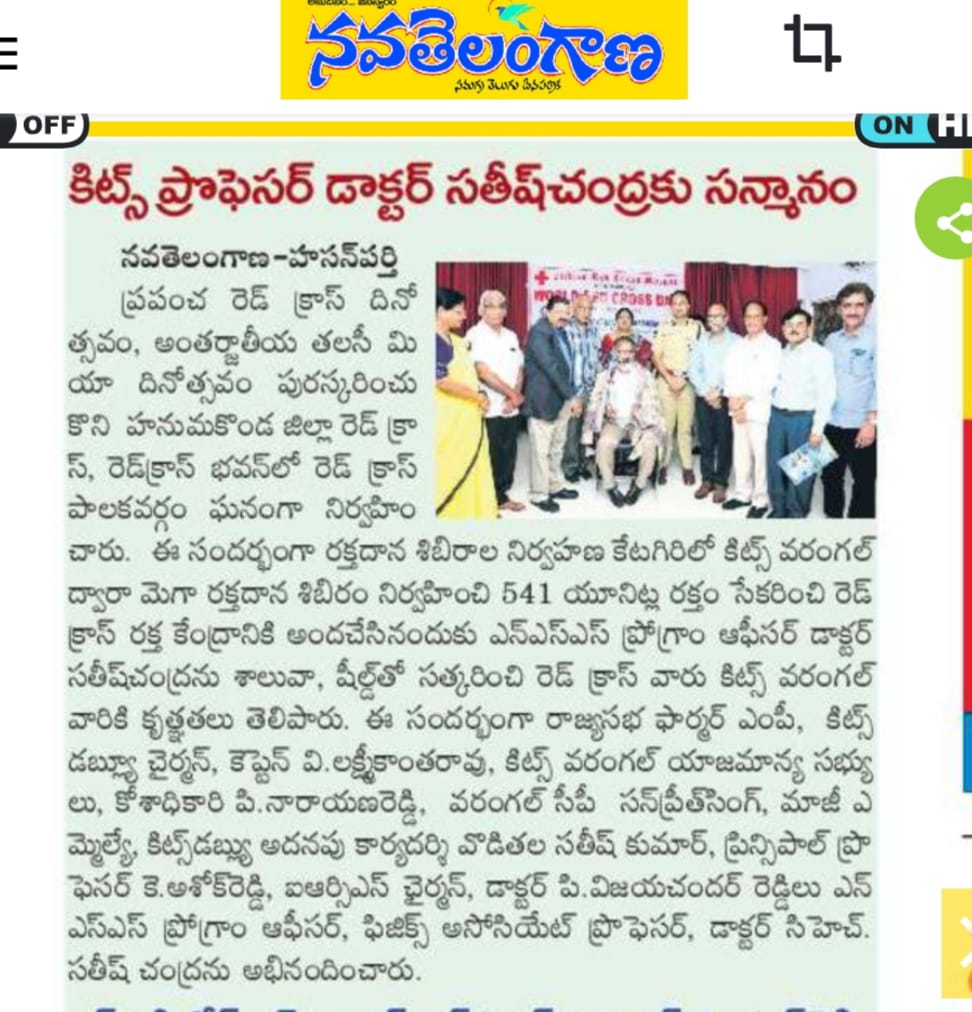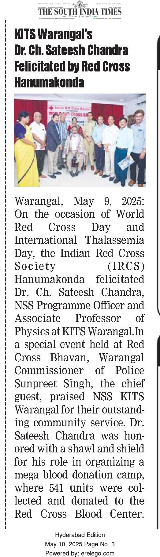 On the occasion of World Red Cross Day and International Thalassemia Day, the Indian Red Cross Society(IRCS), Hanamkonda felicitated Dr.Ch.Sateesh Chandra, NSS Programme Officer and Associate Professor at KITS, Warangal.