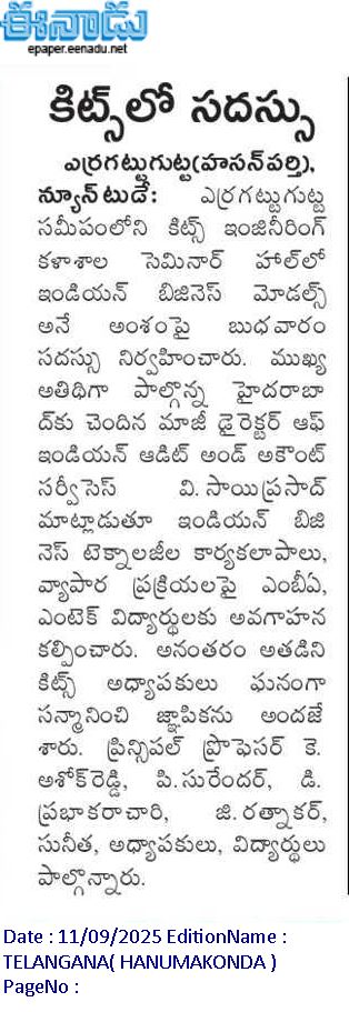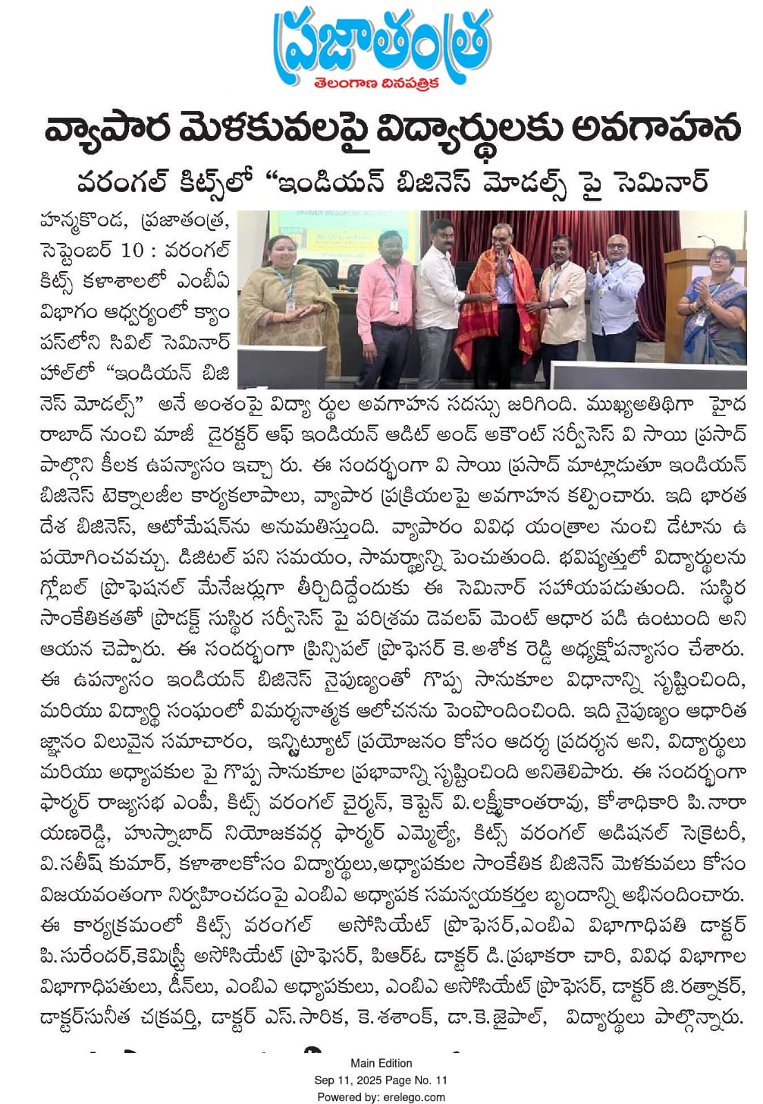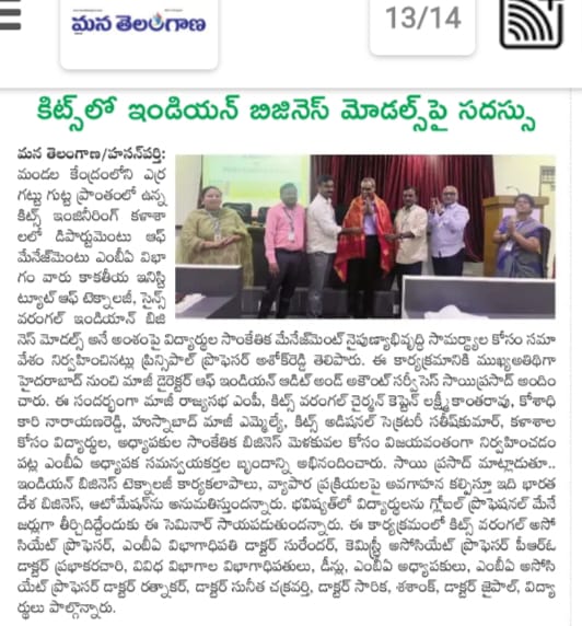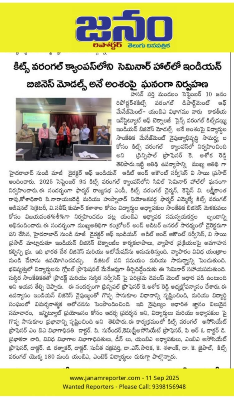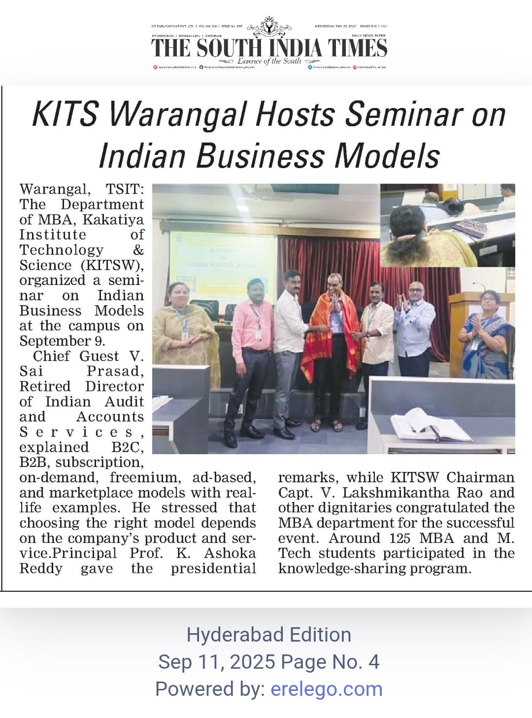 The Department of MBA, Kakatiya Institute of Technology and Science, Warangal organized a Seminar on "Indian Business Models" on 9th September, 2025 at the Campus.
