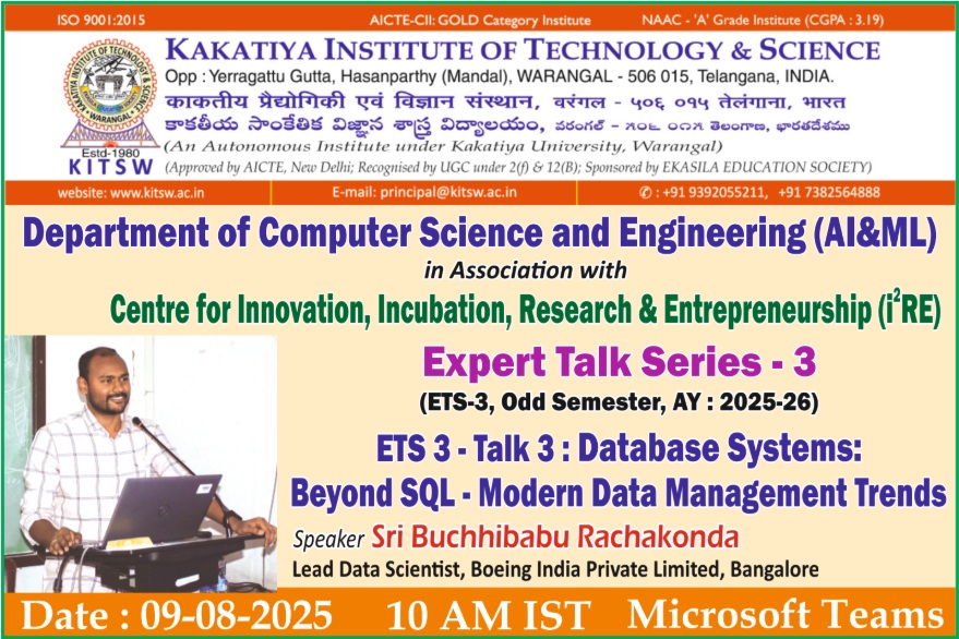 Expert Talk Series (ETS )-3 (Talk1,Talk2 and Talk3) being organized by the Department of Computer Science and Engineering (CSM), in association with i2RE (Innovation and Incubation for Research and Entrepreneurship). These sessions are intended for Second-Year B.Tech students of CSE / CSM /CSD/ CSN / CSO / IT branches. |