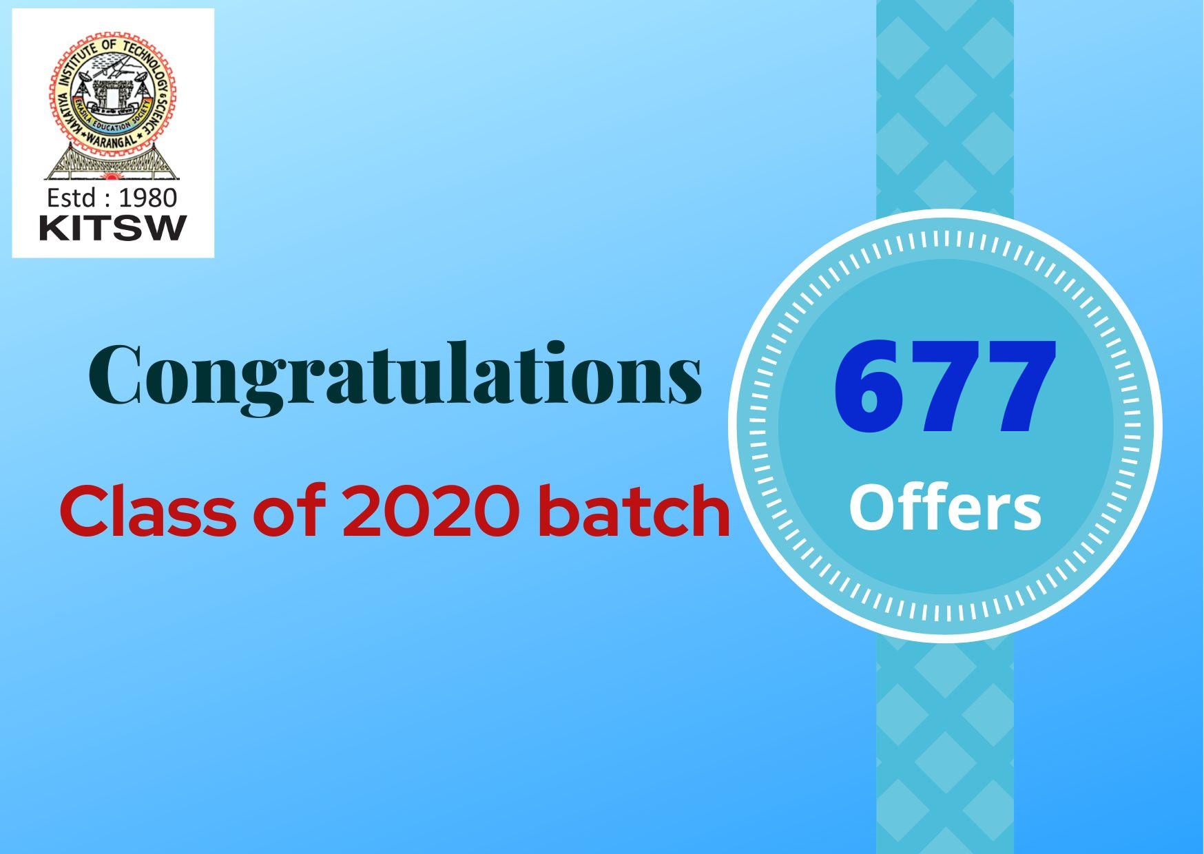 The outstanding Engineering curriculum and academic fundamentals taught at KITS continue to produce exceptional graduates. Accordingly, our internship hiring from this year’s class has doubled from last year. With relentless support from Management, Principal, professors and students, the T&P Cell has been growing from strength to strength and is striving towards the ultimate goal of maximum placements for the students.