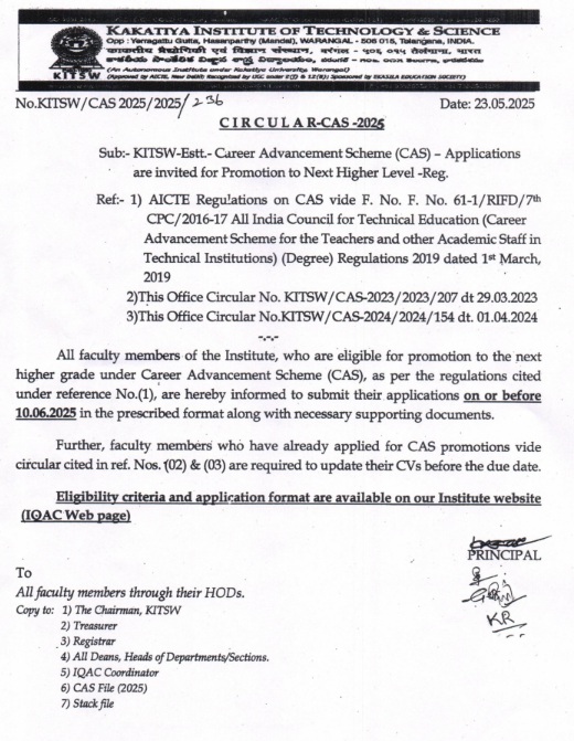 KITSW CAS Senior Professor (Level-15) application form May, 2025